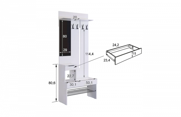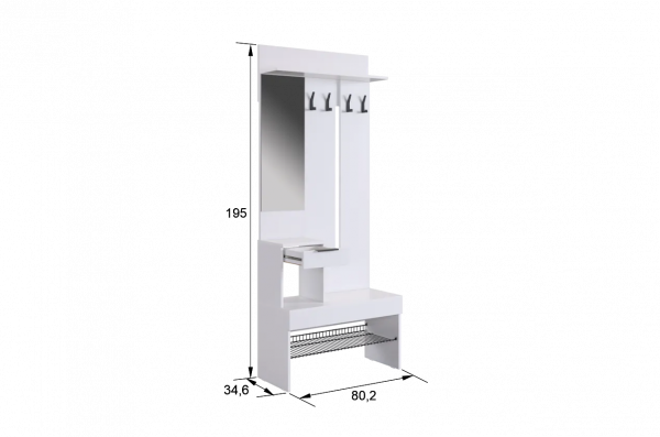 Крючки для одежды обеспечивают удобное место для размещения верхней одежды и аксессуаров, а выкатной ящик предоставляет дополнительное пространство для хранения мелочей. Сетчатая полка для обуви позволяет аккуратно разместить обувь, обеспечивая вентиляцию и легкий доступ.