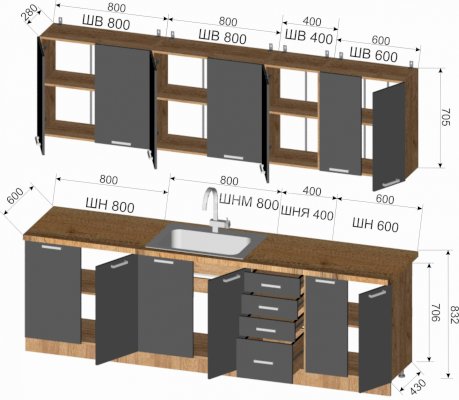 Габариты кухни 2600 мм (ШхВхГ):