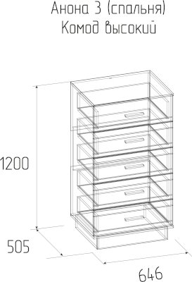 Комод высокий АНОНА 3 с 5 ящиками - очень вместительный, практичный и стильный предмет домашнего интерьера, который соответствует всем правилам эргономики. Узкий комод с древесными вставками не займет много места в сальне. Выдвижные ящики удобны для хранения белья, одежды и аксессуаров. Ящики оснащены шариковыми направляющими полного выдвижения. Это дает возможность использовать всю полезную площадь ящика.